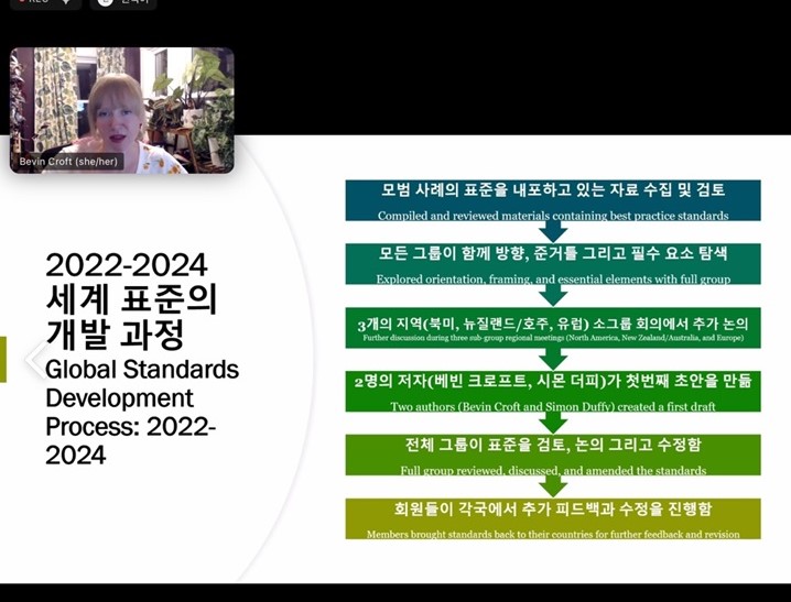 오늘 강연회는 한국의 참여자들이 한국 장애인복지에 대해 질문하고 공유하는 시간으로 시작되었습니다. 이후 각 나라의 초안을 바탕으로 그룹들과 옹호자들, 장애를 가진 당사자들, 정부 기관들과 논의한 세계표준 개발 과정을 학습하는 시간을 가졌습니다. 17가지 조항을 하나씩 짚어가며 자기주도지원에 대한 당사자들의 생생한 경험을 듣고 질문하는 시간이었습니다.